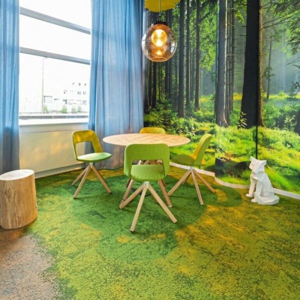 Biophil: Kollektionen wie Human Nature von Interface erinnern an Waldböden, Kieselwege, bemooste Steine. Organische Texturen und gedeckte Grüntöne bringen Natur in den Innenraum – ganz ohne Pflanzen, aber mit messbarer Wirkung auf Stresspegel und Konzentration.