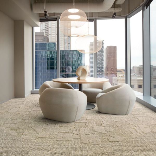 Trispace plant Bodenbeläge als Teil der Raumgestaltung. Mit Teppichplatten von Interface, EGE und weiteren Herstellern. Mit LVT für Nassbereiche. Und mit eigenen Baumanagern, die das Projekt von der Musterauswahl bis zur Verlegung begleiten.
