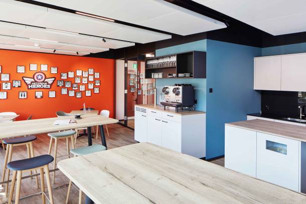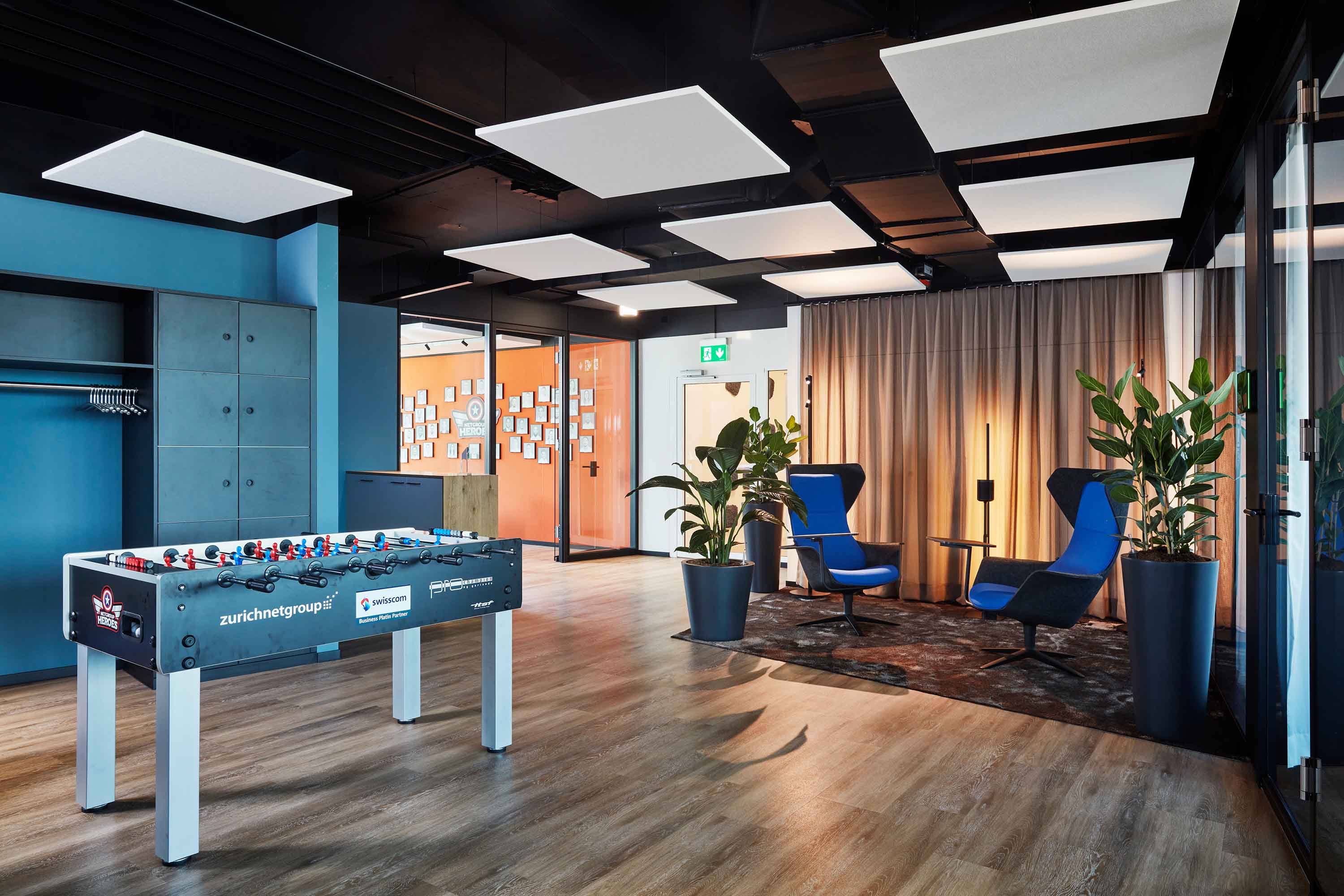 Nicht nur der schöne Blick auf den Zürichsee, sondern auch die Vielfalt an unterschiedlichen Zonen mit Tischtennis oder Tischfussball sowie die Cafeteria geben den Mitarbeitenden Gemeinschaftsflächen, die sie motivieren, in die Büros zu kommen.