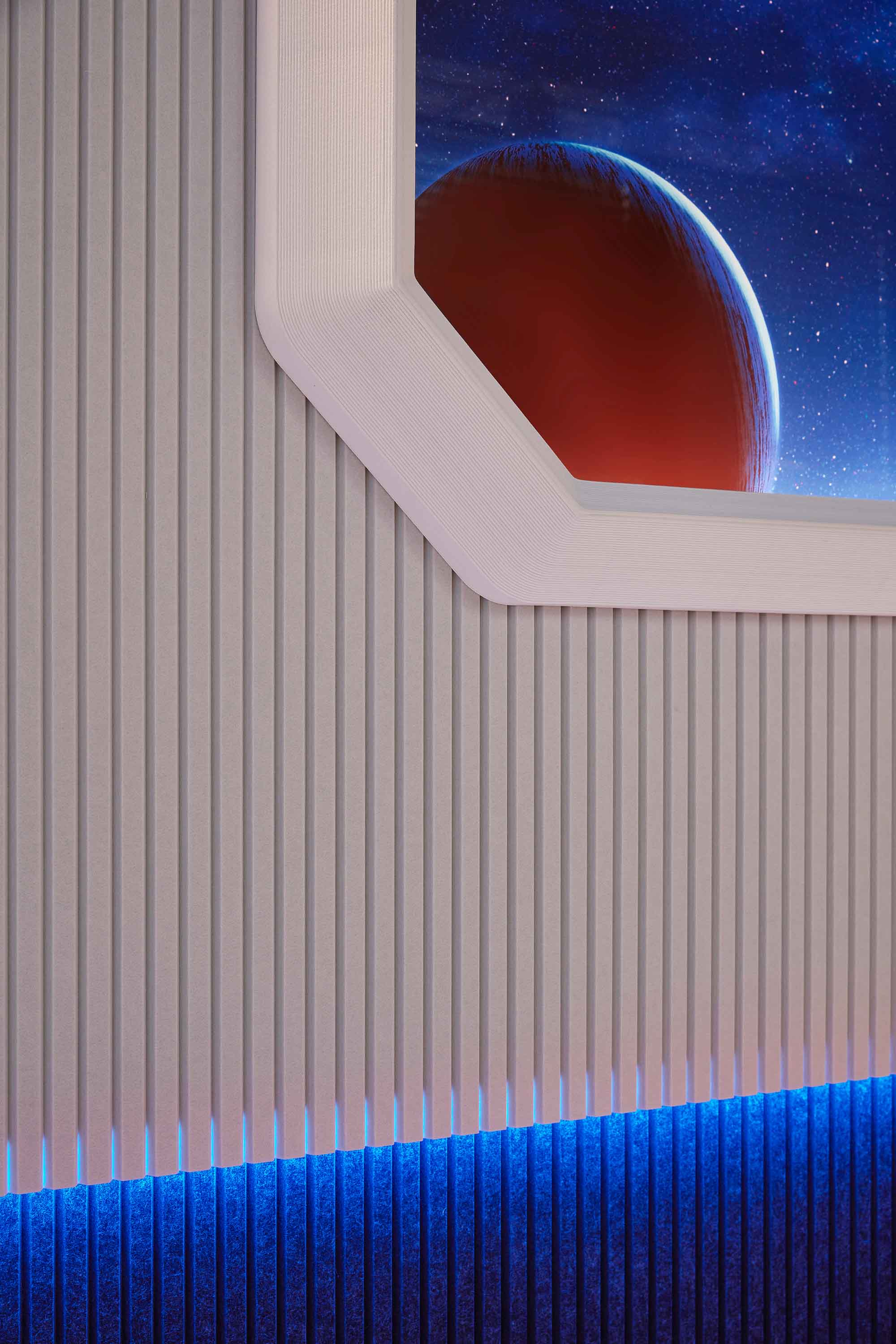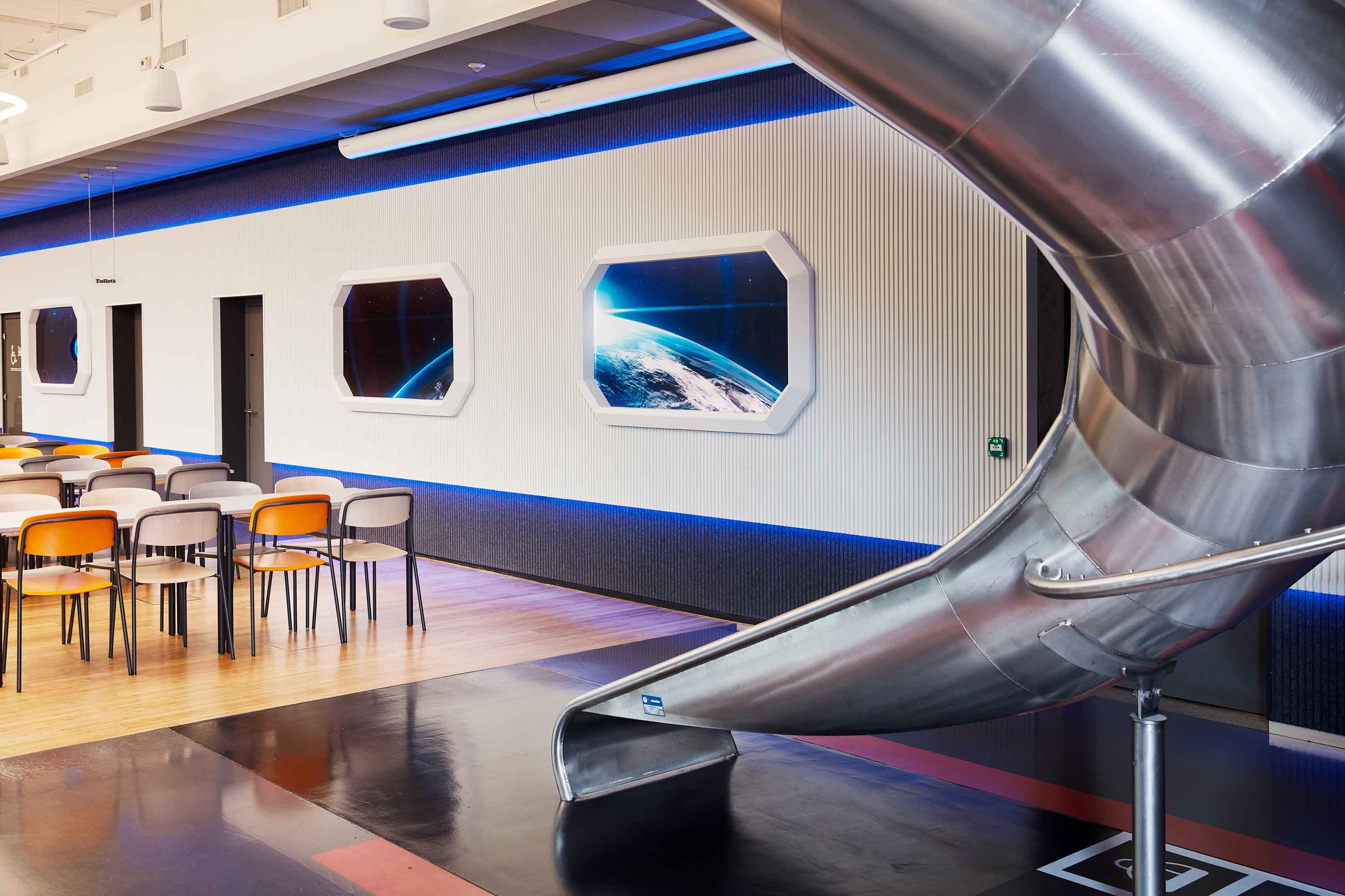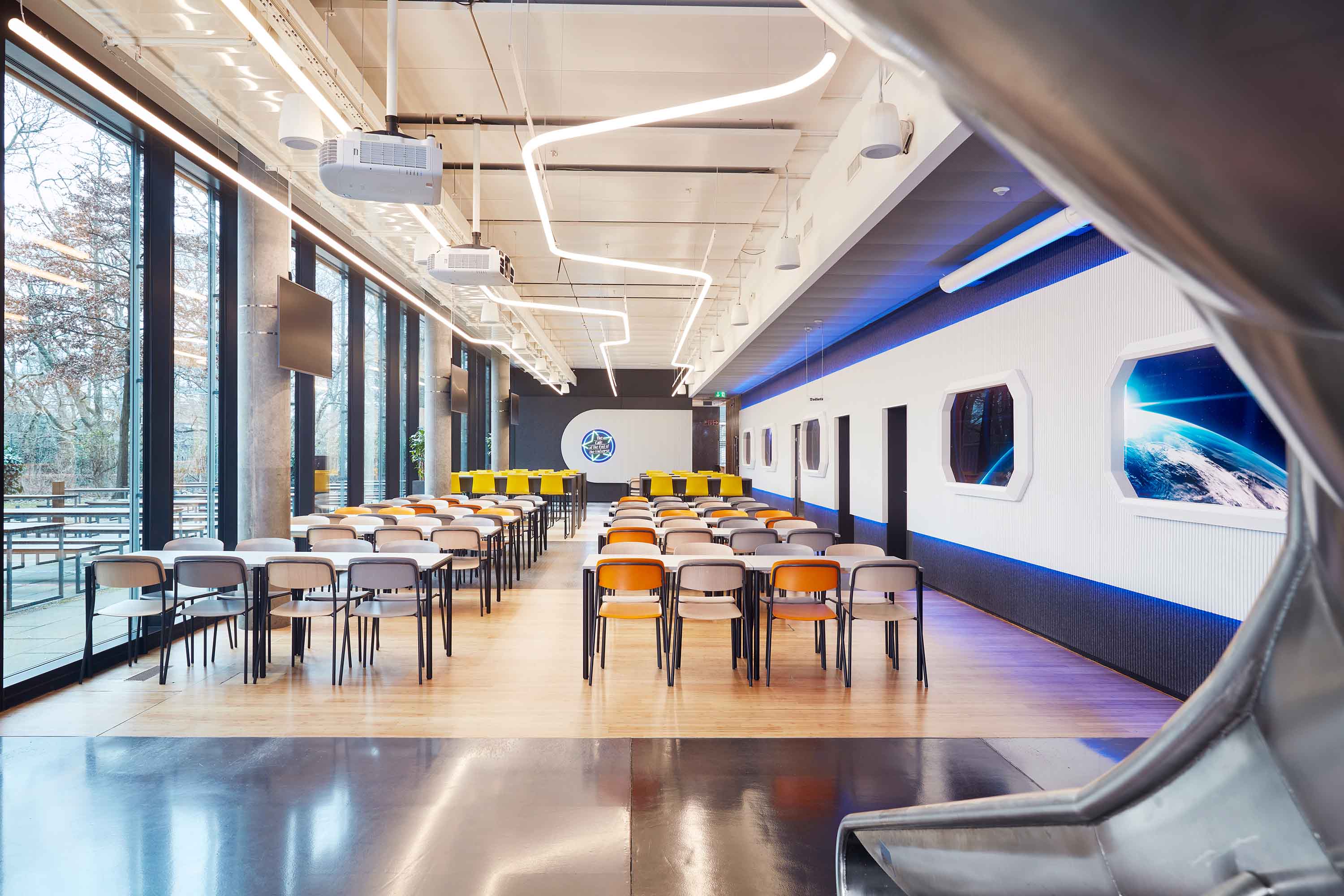 Die Sanierung des Mitarbeiter-Restaurants brachte neben einer Sitzplatzverdichtung auch akustisch und ästhetisch einen erlebbaren Mehrwert. Ganz im Sinne des namengebenden Romans «Per Anhalter durch die Galaxis» von Douglas Adams wurde die Atmosphäre eines Restaurants am Ende des Universums interpretiert. Dazu wurden hochwirksame Wandabsorber sowie individuell angefertigte 3D-gedruckte und hinterleuchtete Deko-Elemente zu einem Raumschiff Interior gestaltet.