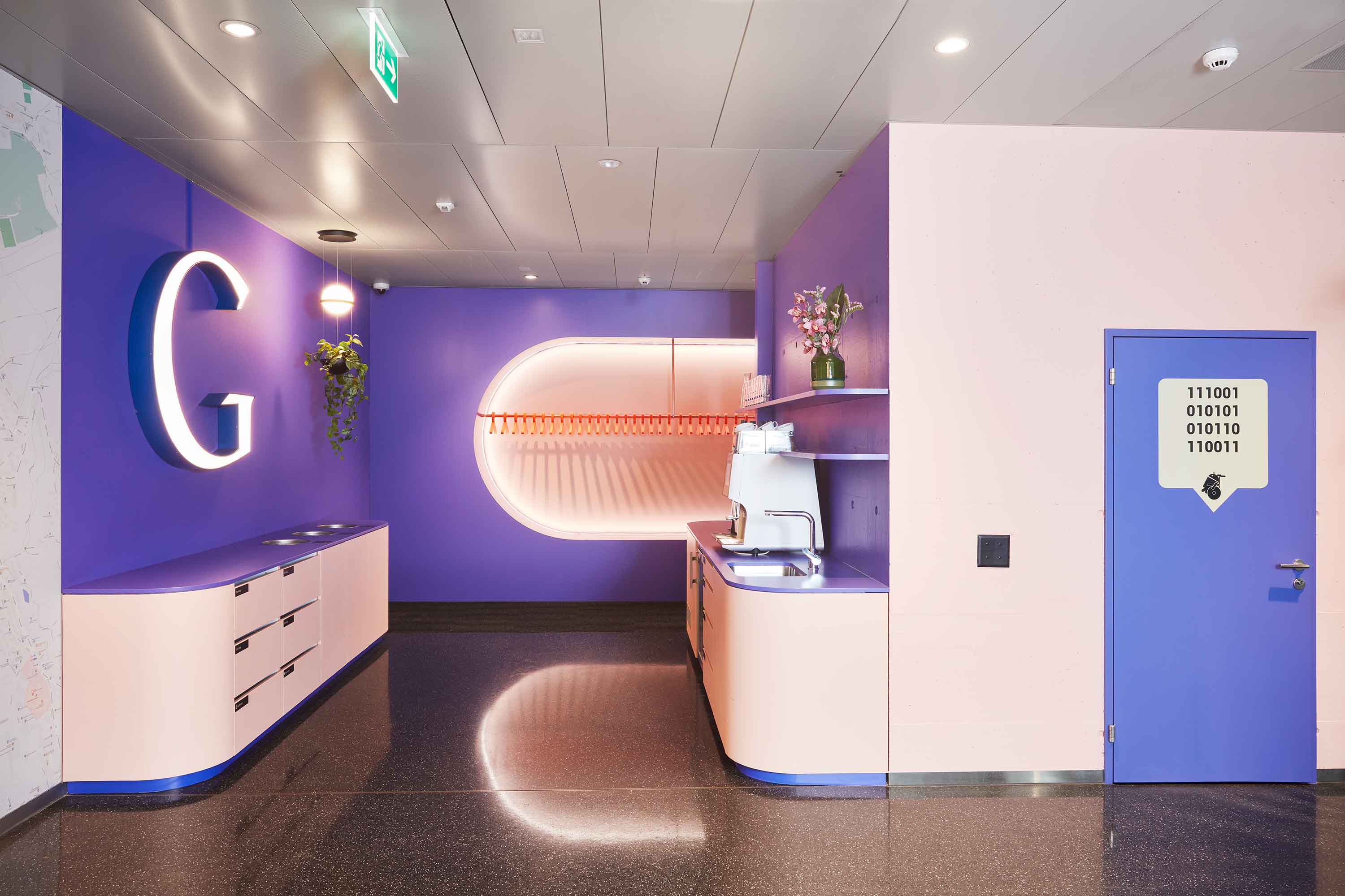 Im Empfangsbereich wurden bestehende Strukturen wie die Empfangstheke übernommen und mit einem «BreakOut Space», einer Garderobenlösung und einem Aufenthaltsbereich ergänzt. Das energetische Farbkonzept erzeugt eine positive Raumatmosphäre und lässt den Bestand mit den neuen Elementen verschmelzen.