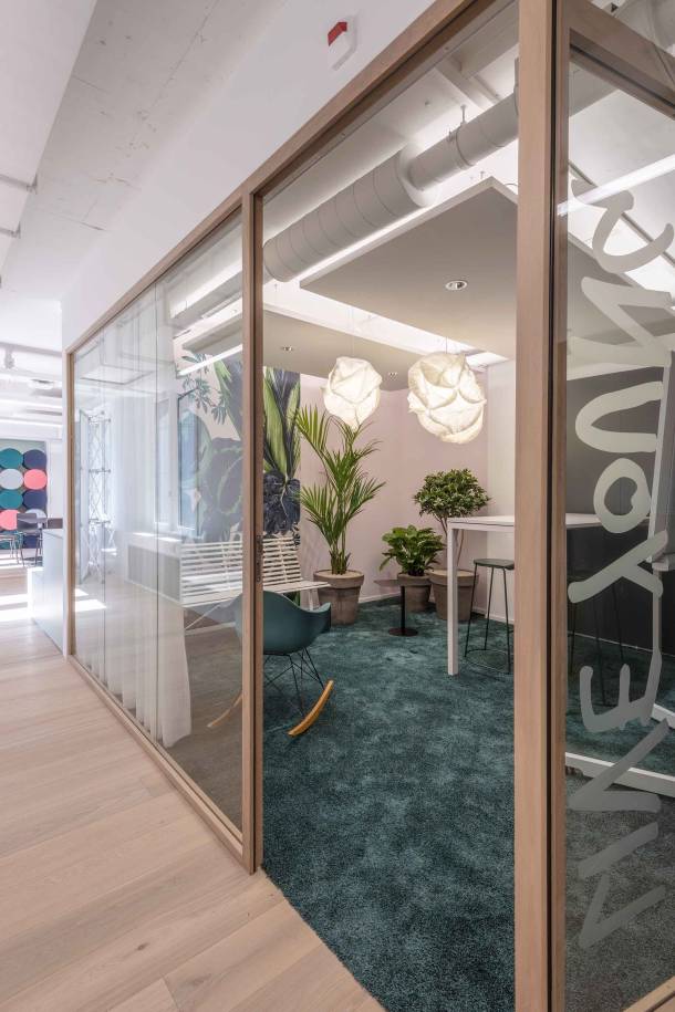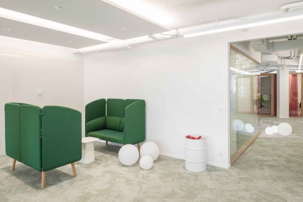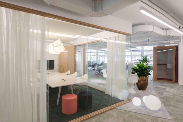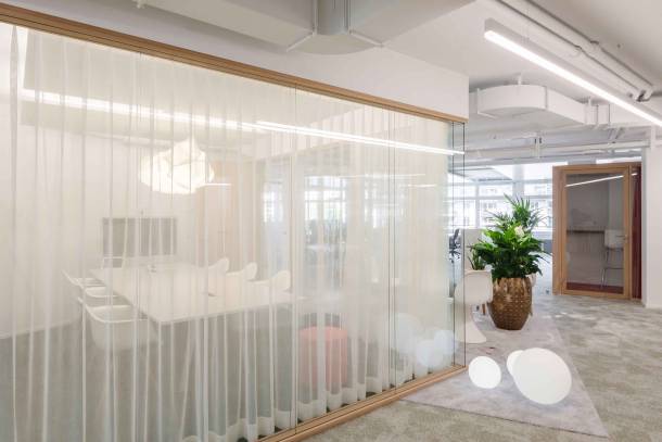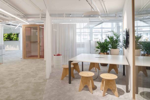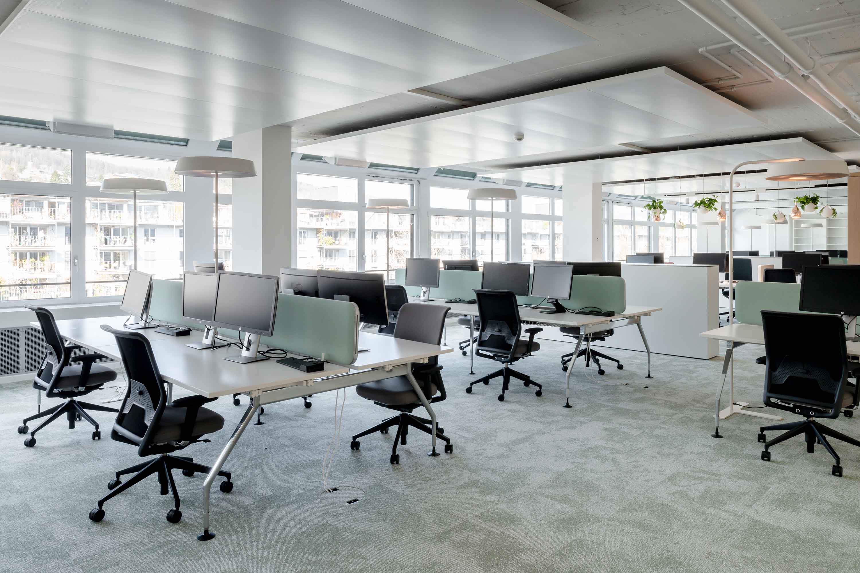 Auf über 1300 m² Bürofläche stehen 80 flexibel nutzbare Arbeitsplätze sowie ein grosses Angebot an Kollaborationsflächen für unterschiedlichste Tätigkeiten zur Verfügung. Neben der Büroeinrichtung entschied sich die Danone AG für Sichtschutz- und Akustikmassnahmen von Trispace.