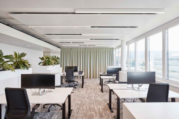 Entstanden ist eine moderne Arbeitswelt, die Platz für bis zu 70 Mitarbeitende bietet. Das hybride Bürokonzept setzt auf fixe und geteilte Arbeitsplätze sowie auf eine Vielzahl an Möglichkeiten für Rückzug und Kollaboration.