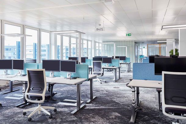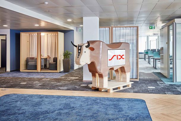 Das Unternehmen SIX Group hat im Hauptgebäude auf einer Fläche von 1400 m² für die IT-Abteilung ein neues kollaboratives Arbeitsplatzkonzept eingeführt. Nebst organisatorischen und strukturellen Änderungen wurden auch bauliche Massnahmen umgesetzt. Die Einführung eines Desk-Sharing-Ratios ergab neues Flächenpotenzial für kommunikative und konzentrierte Arbeitstätigkeiten.