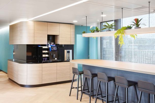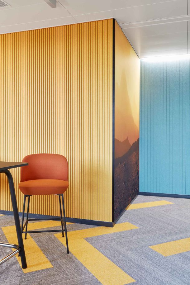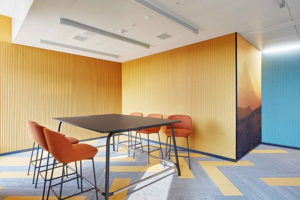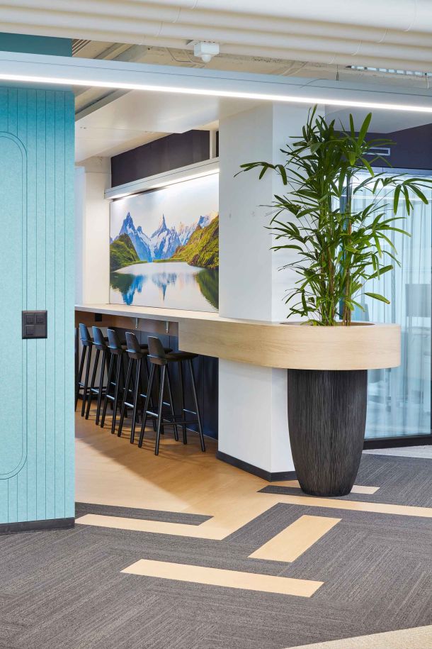 Die Neukonzeption der Cafeteria sah eine Verdoppelung der Nutzfläche sowie ein grosses Angebot an unterschiedlichen Sitzgelegenheiten vor. Weiter wurde das Look’n’Feel auf die überarbeiteten Branding-Guidelines angepasst. Je nach Raumkonzept wurde die Atmosphäre mithilfe von Farben, Materialien und Mobiliar individualisiert. Schlussendlich wurde dem Kunden eine farblich harmonische und akustisch perfekt abgestimmte Arbeitswelt übergeben.